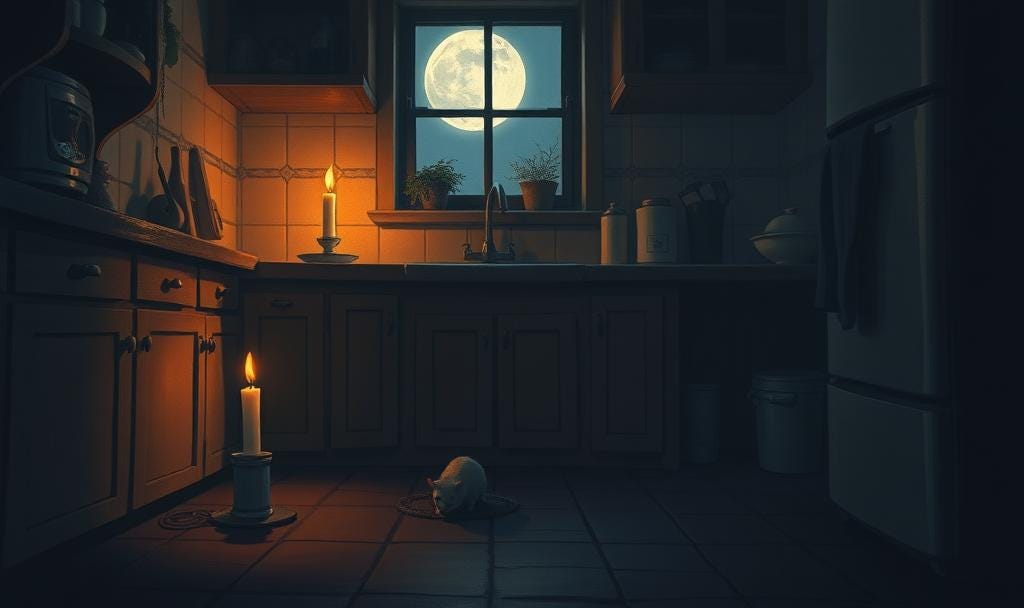 I sat down on the floor, beside the rat, glue trap and all, while the candle’s light flickered softly, and the fridge hummed like a distant heartbeat.